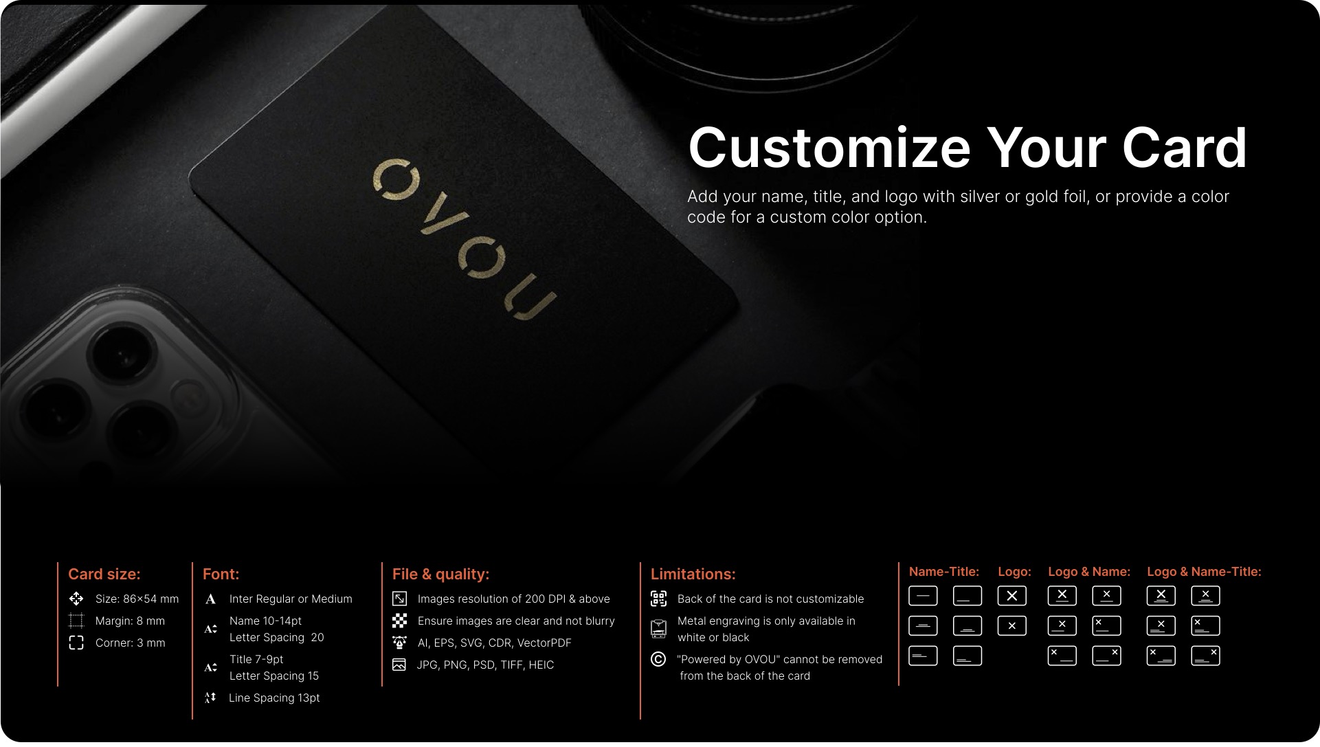 Make your OVOU Smart Card truly yours by adding a personal touch! Whether it’s your company logo, your name, or a tagline, our customization options allow you to create a card that reflects your brand identity. Here’s everything you need to know about customizing your card.